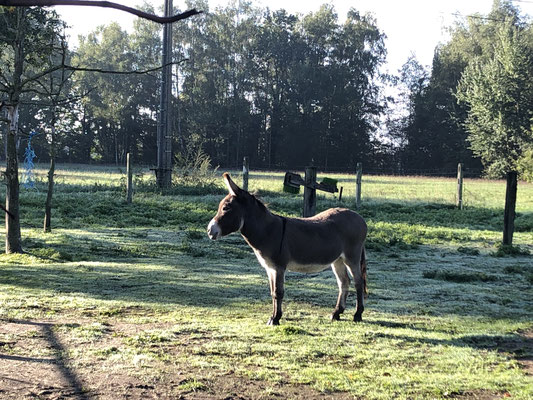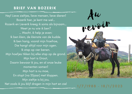 Mijn naam is Liselotte en ik ben geboren in de weide van Bozerik in 2003. Zij is een soort mama voor mij geweest en ik beschermde haar wanneer ik dacht dat ze het nodig had. Ik lijk op een Provençaalse ezel met mijn grijze vacht, witte neus en op mijn rug draag ik een tekening van een groot zwart kruis.
